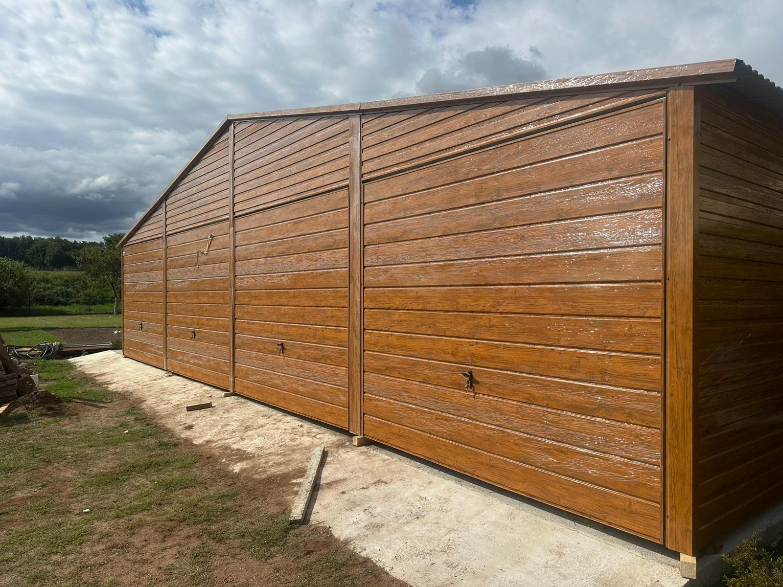 Plechová garáž 12×5 m | sedlová strecha RAL 8017 | zlatý dub | 4× výklopná brána