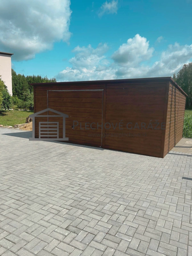 Plechová garáž 7×6 m – spád dozadu, tmavý orech, pevná JOKL konštrukcia