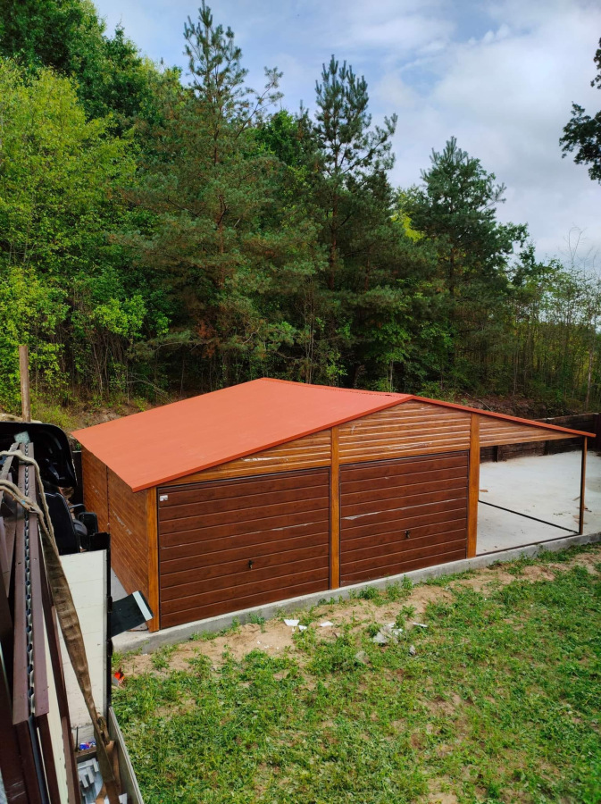 Plechová garáž 9×6 m s prístreškom 3 m – drevodekor zlatý dub/orech, strecha RAL 8004